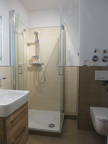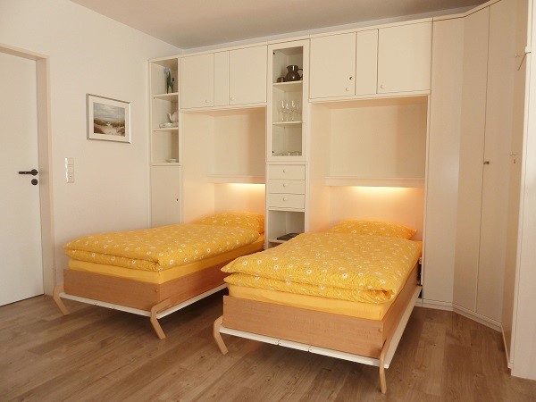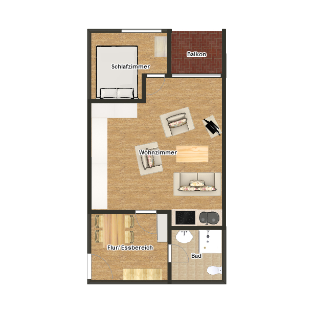 Die Wohnung hat einen idealen Zuschnitt und verfügt über einen kleinen Schlafraum mit einem Doppelbett und einem großen kombinierten Wohn-Schlafraum mit einer Küchenzeile und zwei einzelnen Schrankbetten. Im Vorraum befindet sich der Essbereich. Dusche/WC und ein überdachter Balkon gehören ebenfalls dazu.